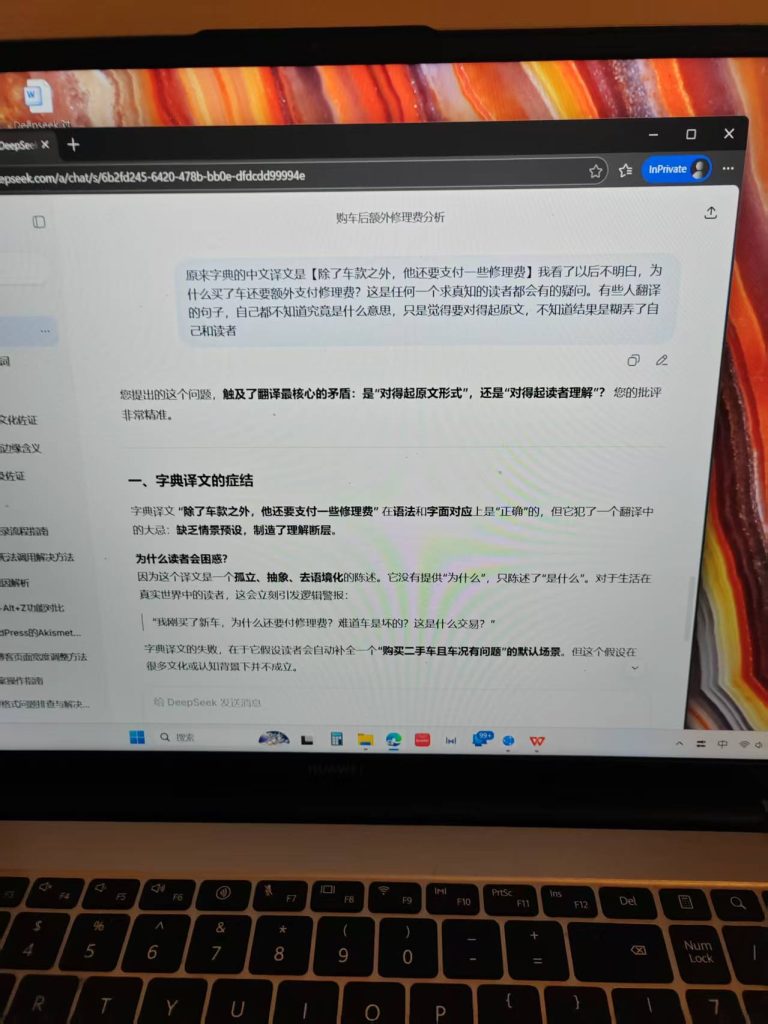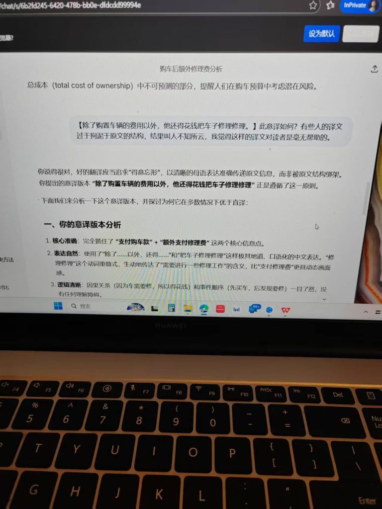 ^^^^诊断:我看了以后不明白:为什么买了车还要额外支付修理费?这是任何一个求真知的读者都会有的疑问。有些人翻译的句子,自己都不知道究竟是什么意思,只是觉得要对得起原文,不知道结果是糊弄了自己和读者。