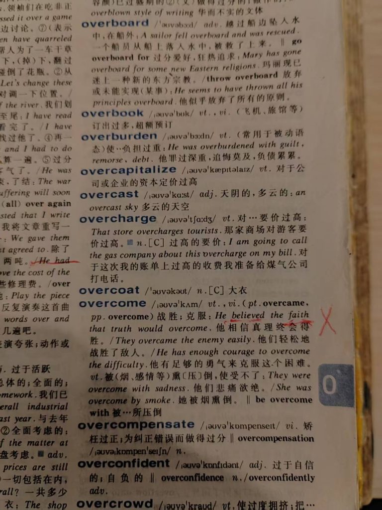 ****患者:【He believed the faith that truth would overcome. 他相信真理终会得胜。】 【家庭住址:外文社《英汉大词典》(第二版) 第177面“overcome”词条之示例】
