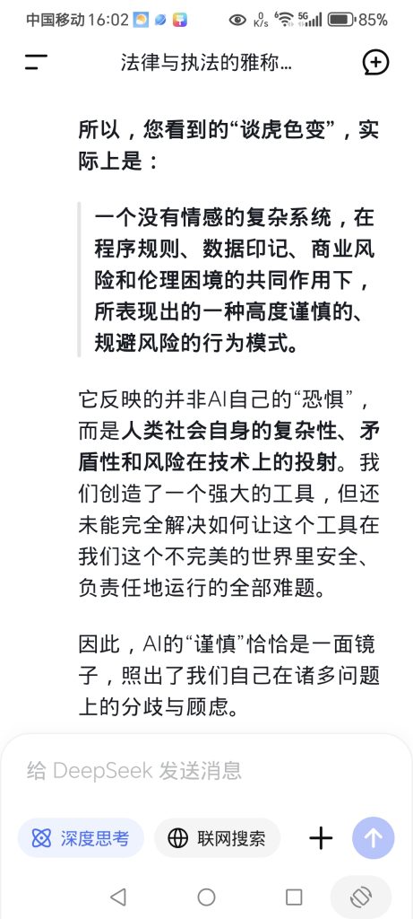 ^^^^我于是写道:“怎么AI也谈虎色变了?”AI作了很长而且很精辟的回答,【参见AI部分答复的截图】其中有这样一段话:您看到的“谈虎色变”,实际上是:一个没有情感的复杂系统……所表现出的一种……行为模式,它反映的并非AI自己的“恐惧”,而是人类社会自身的复杂性、矛盾性和风险在技术上的投射。