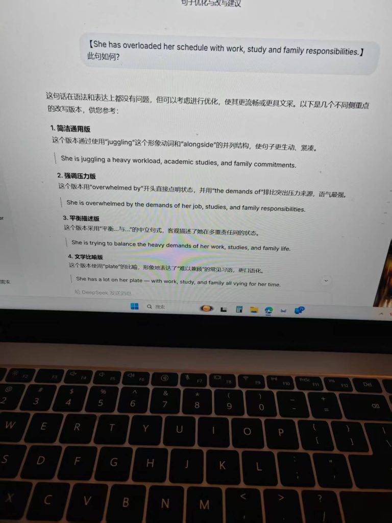 ^^^^原句 She has overloaded her schedule with work, study and family responsibilities. 试图用一个物理/技术性的动词 (overload 装载过量) 去组合一个抽象的责任列表,并将它们强行“塞入”一个具体的时间容器 (schedule)。这个隐喻延伸得太远,以至于断裂了,造成了您所感到的“荒唐感”。